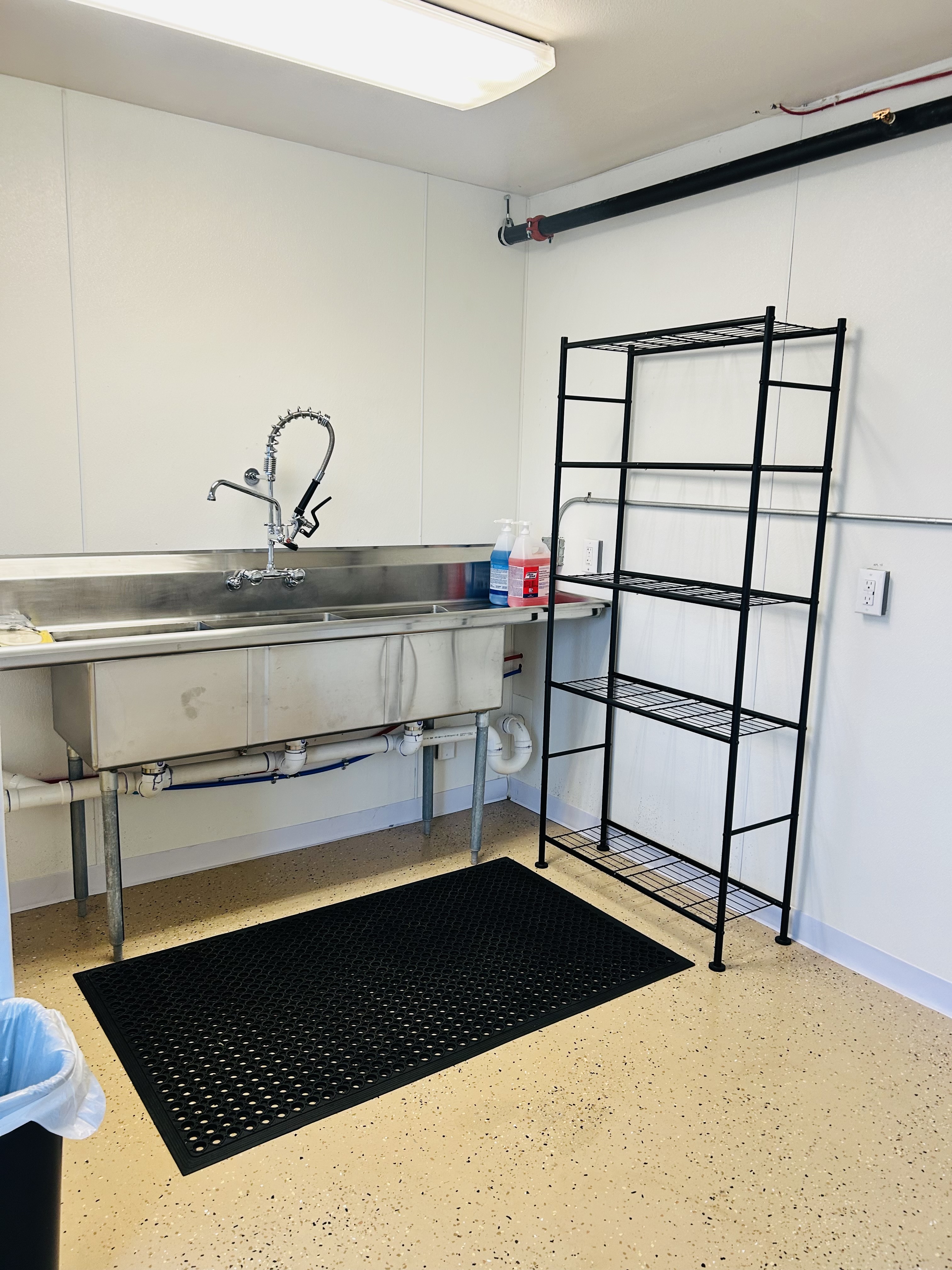 3-Bay wash sink and prep tables along with space for dry storage and to bring your own refrigerator.