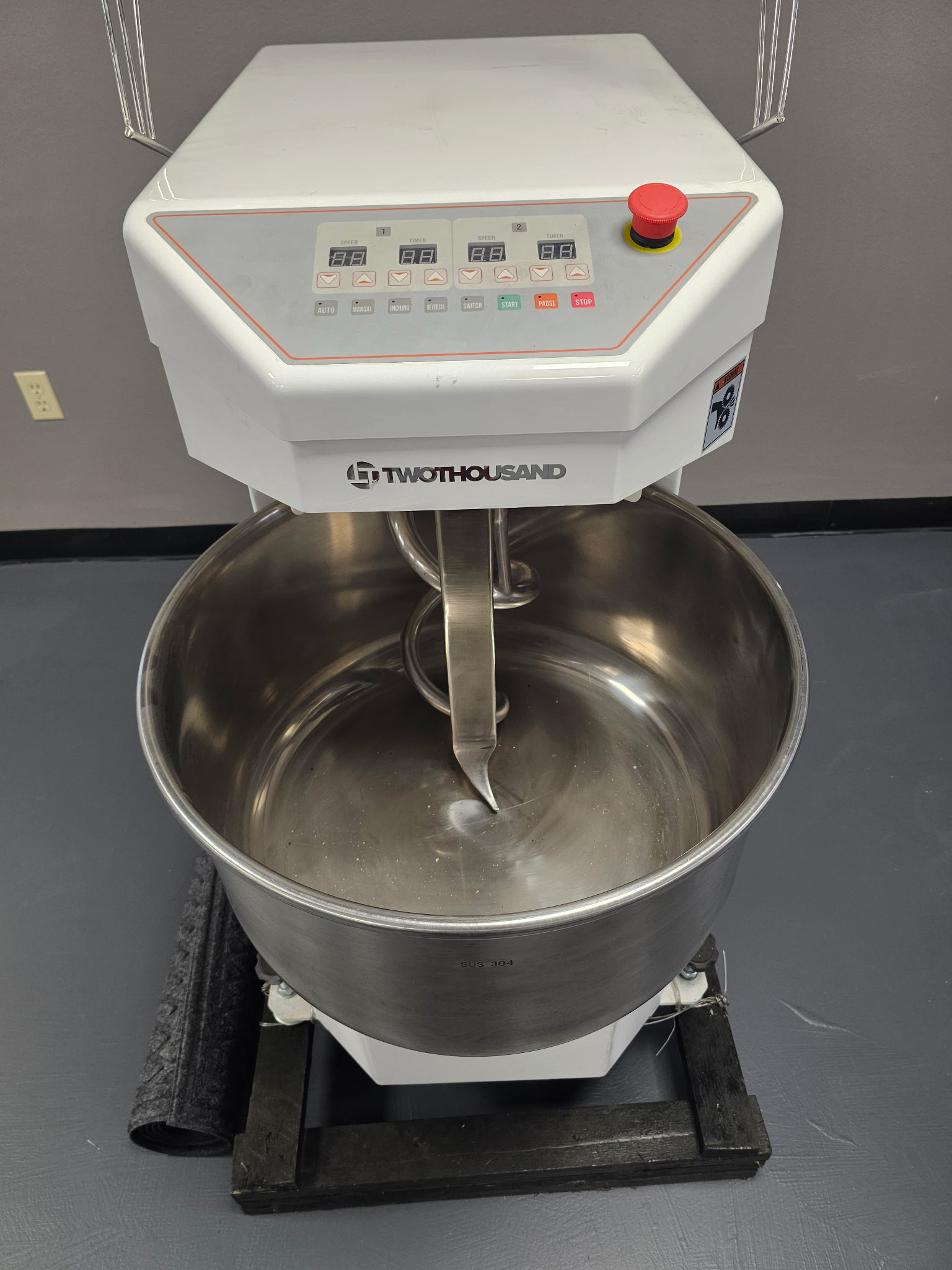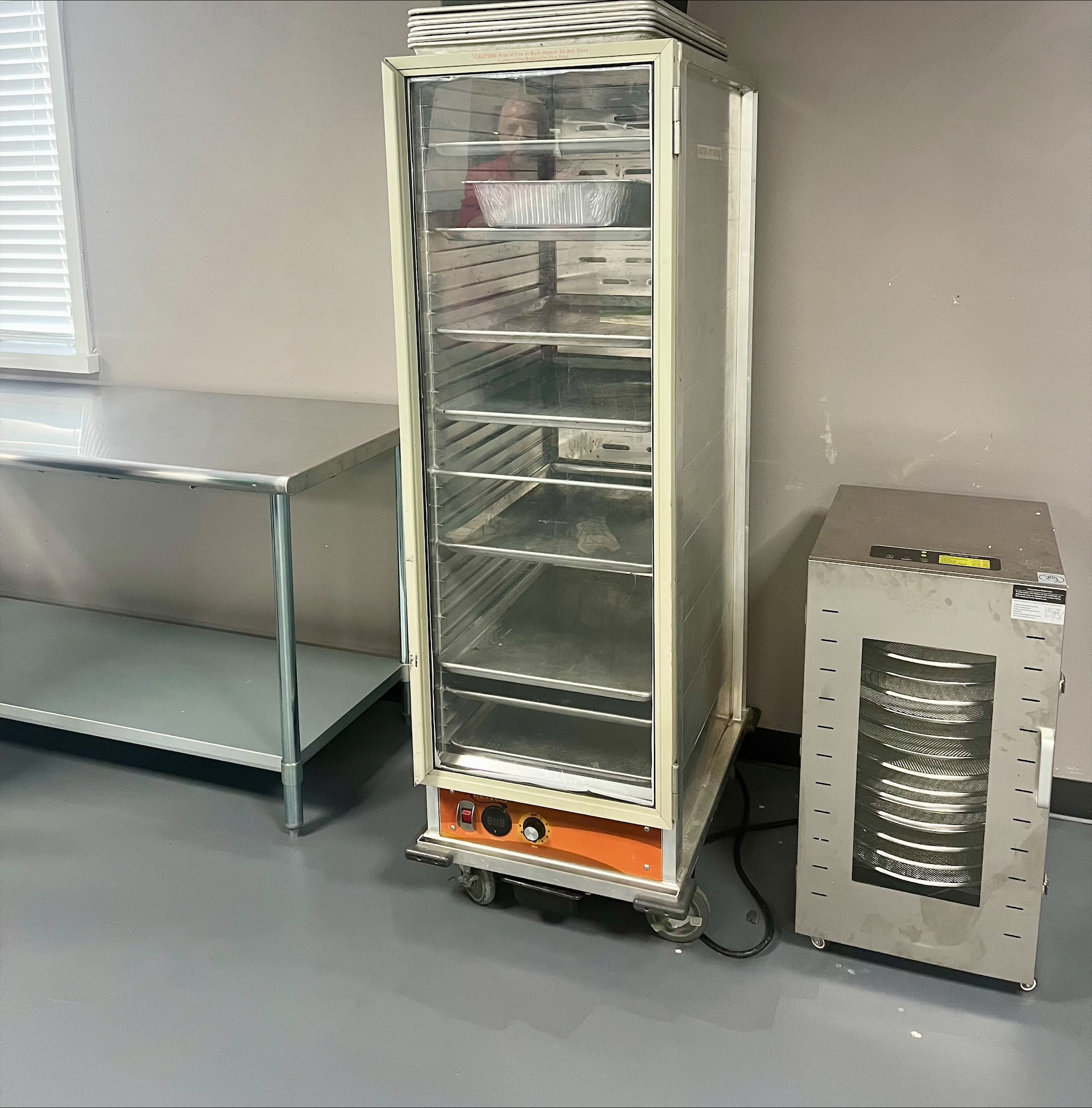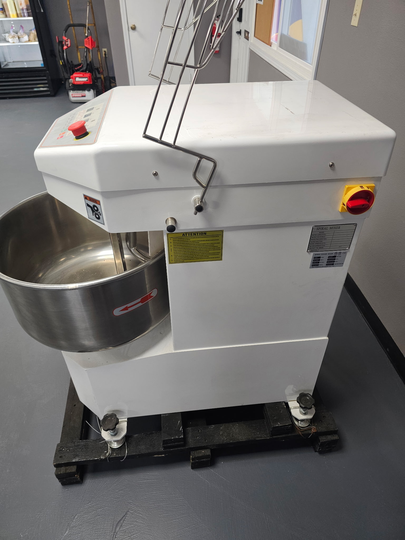 2. Baking Station-Industrial Mixer, pizza oven, and a speed rack.