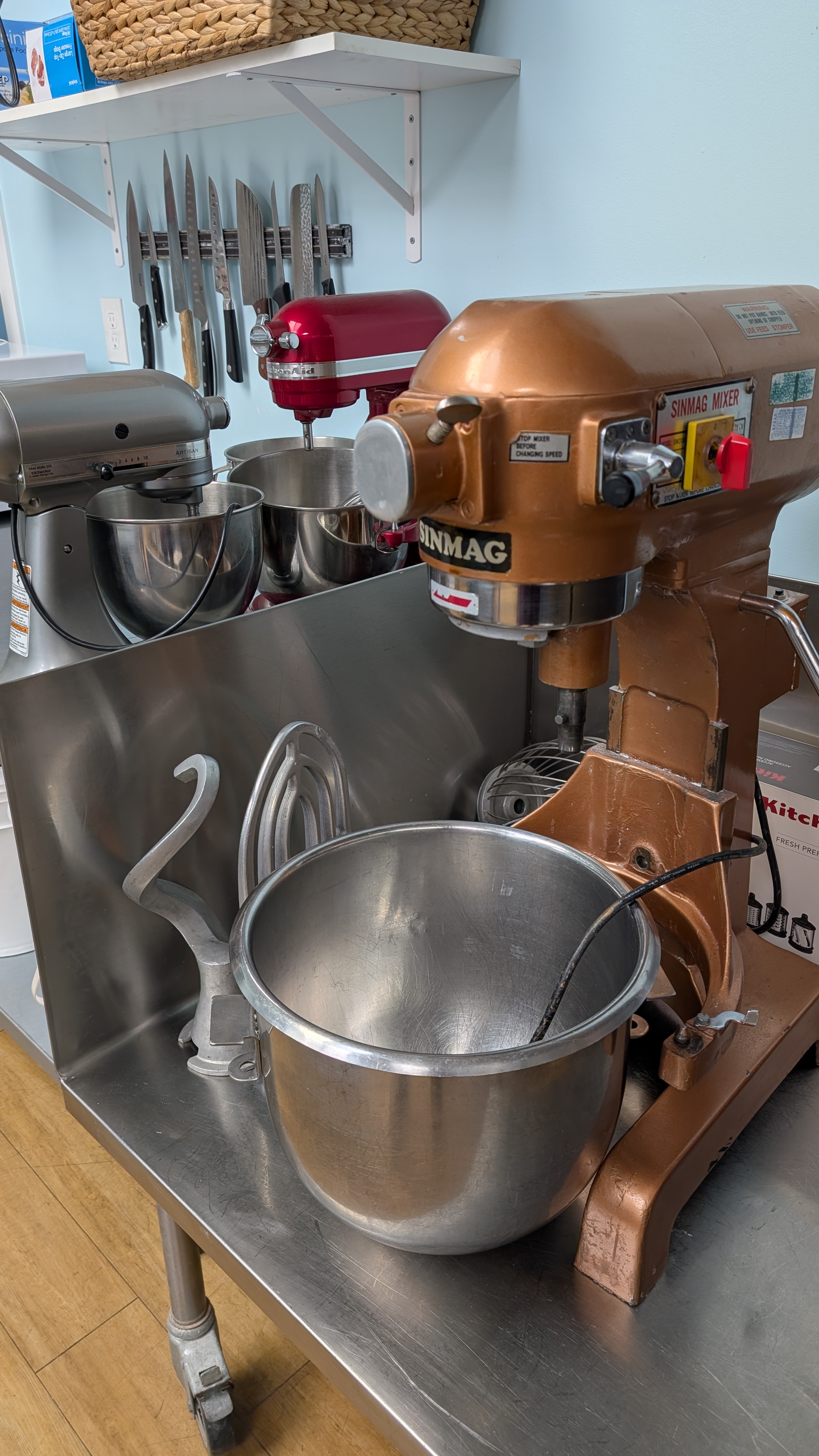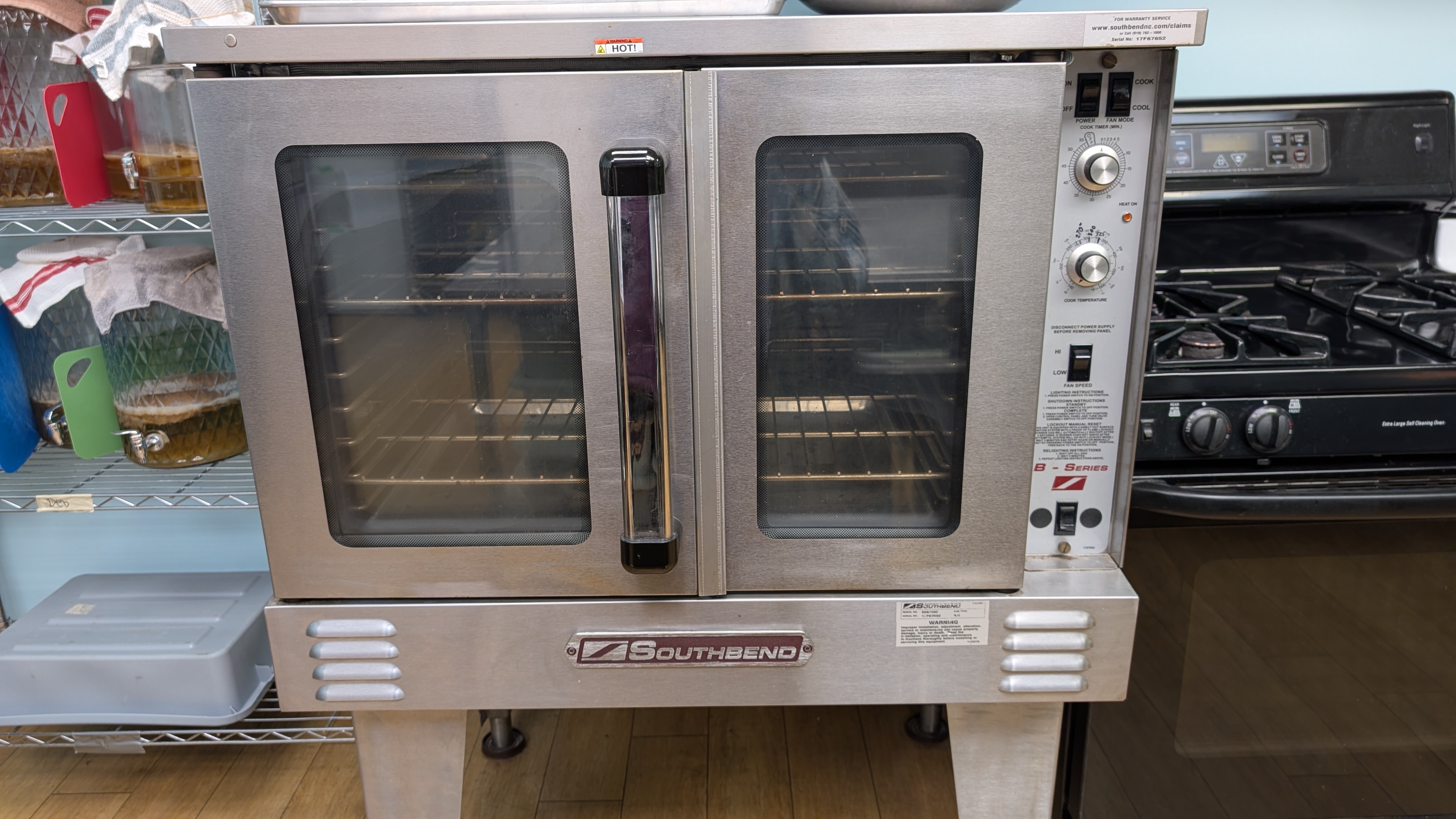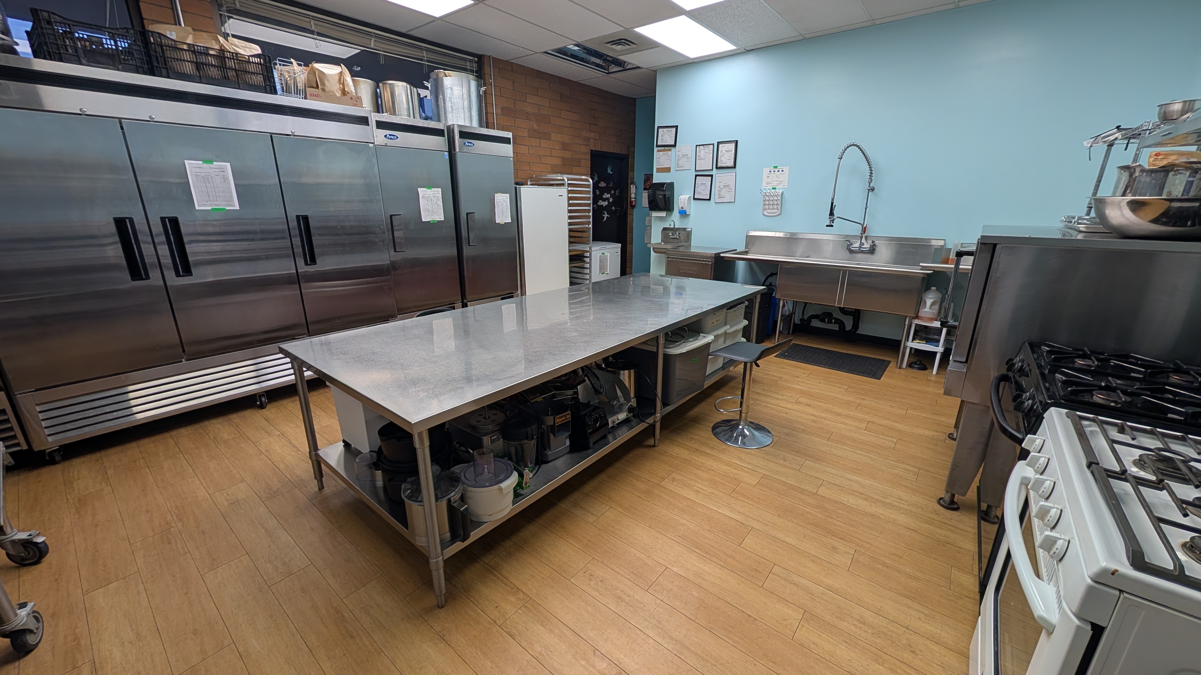Lots of counter space, storage space, sinks & dishwasher, commercial convection oven, stoves with ovens, mixers, microwave, fridge & freezer. We cannot cook anything with grease on the stoves (no cooking meat, butter, etc on the stovetop, but oven is ok).