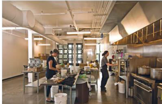 Fully equipped kitchen with storage and a large Walk-in cooler. Garage door for easy loading.