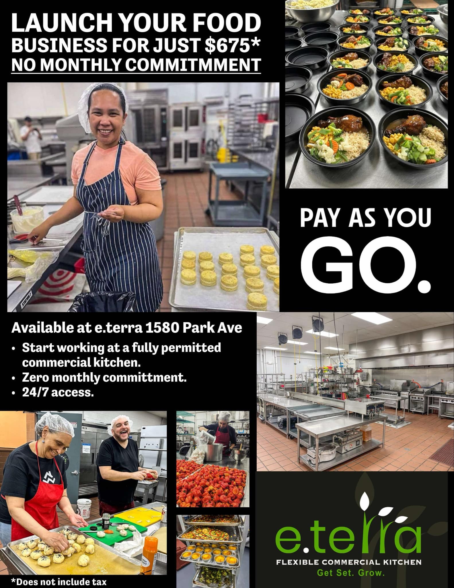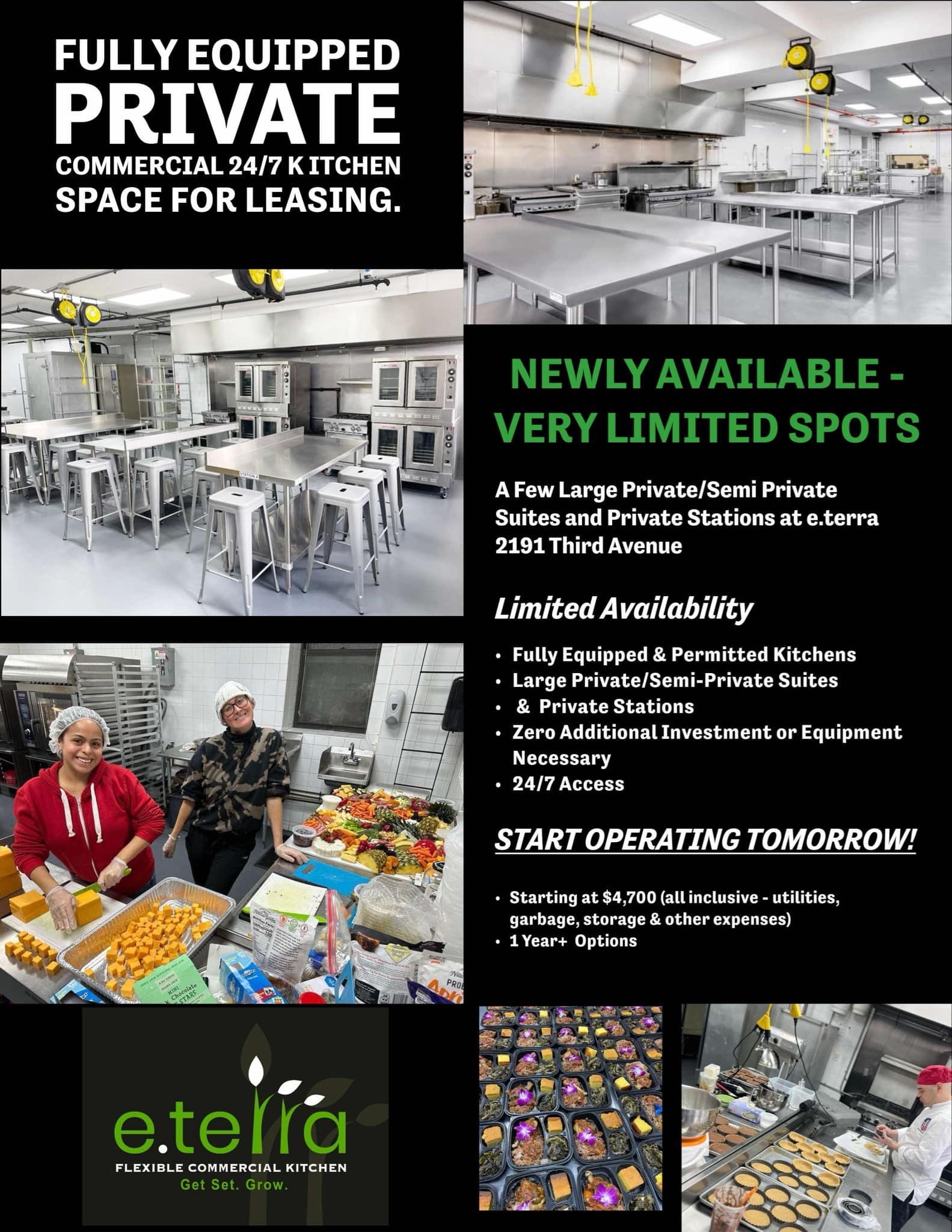 eterra provides membership based plans or one-off event bookings of its various kitchen spaces. Membership plan requires a minimum commitment of 20 hours per month. Members can choose to rent on an hourly, monthly or yearly basis, with larger user plans, including full private kitchen suites 24/7 or on a full day or night shift basis, as you scale!