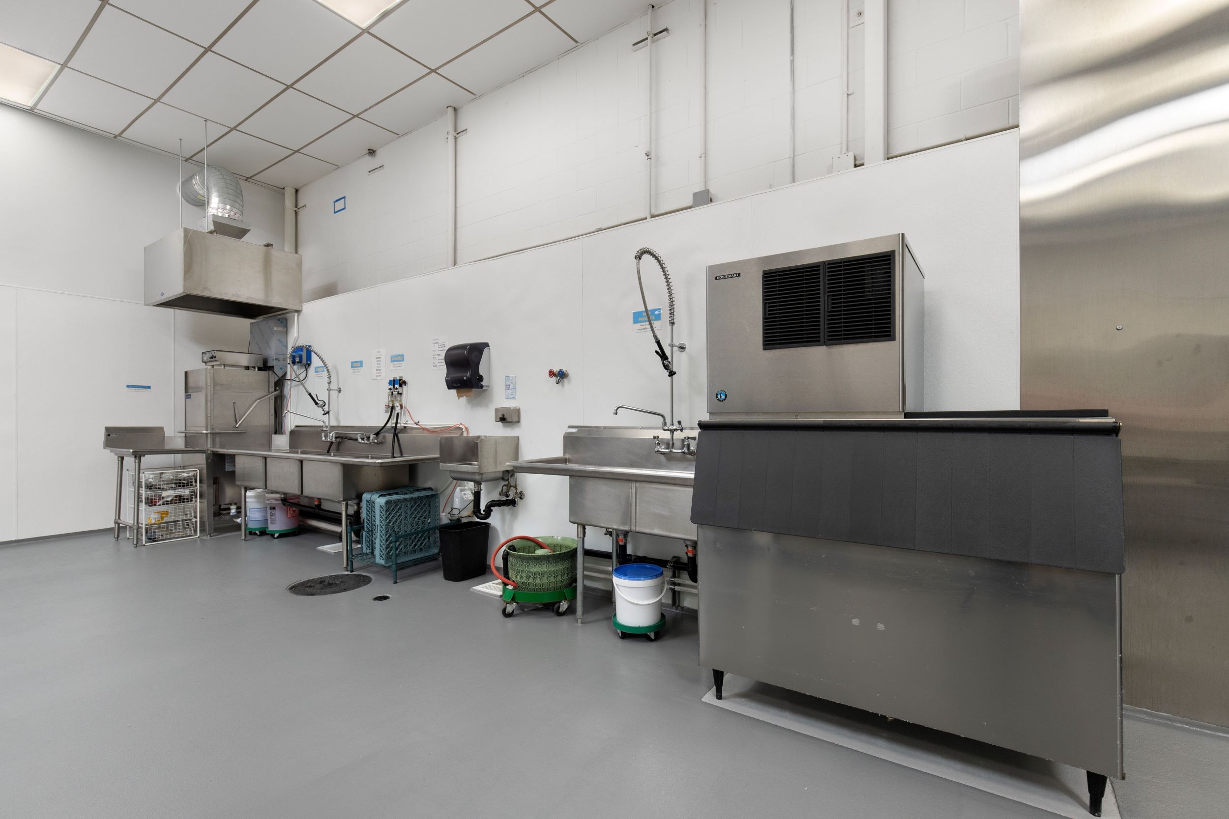 o 2 dish stations with commercial dishwasher and 3-compartment sinks