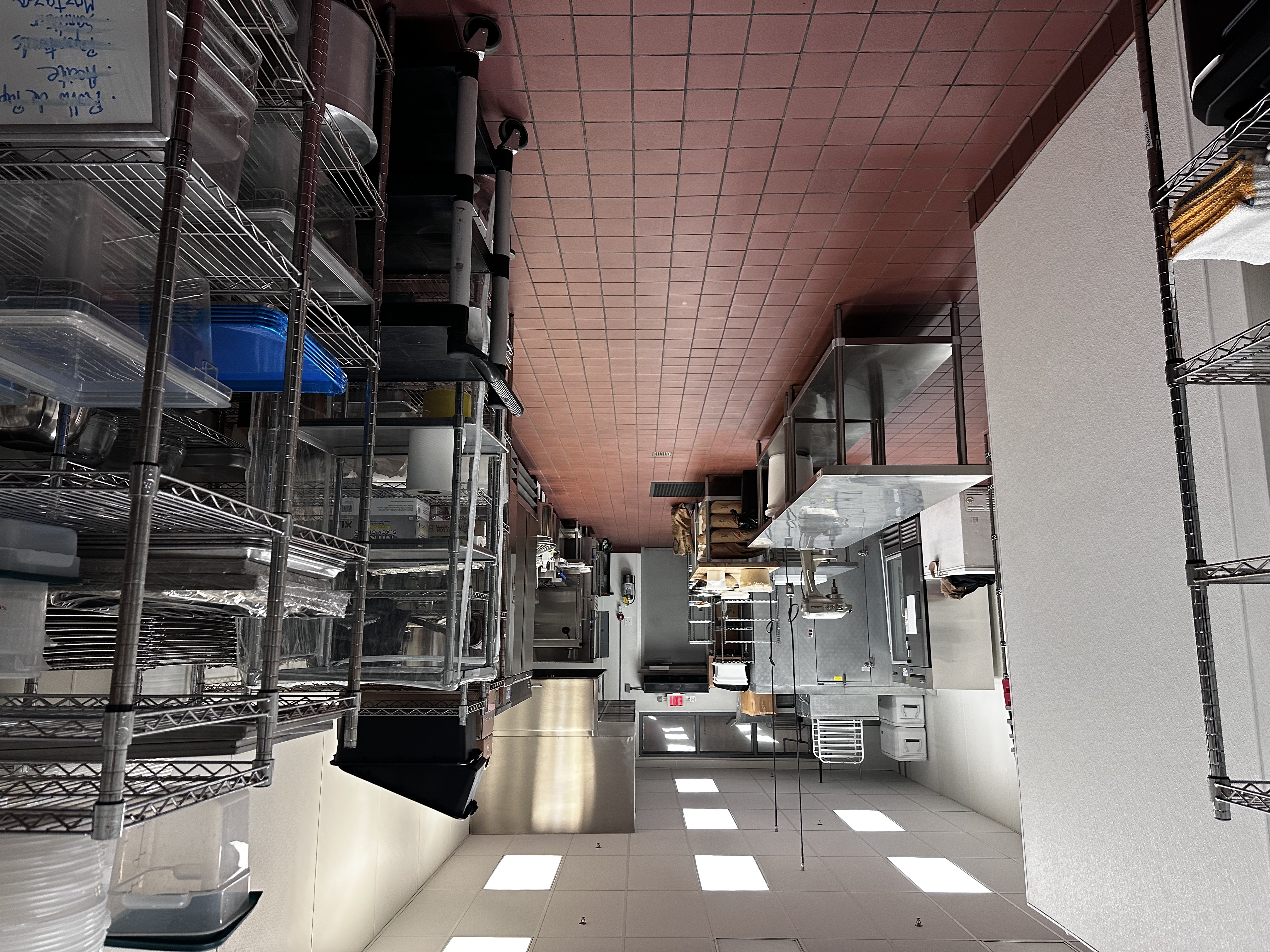 The kitchen is fully licensed and insured and offers 1340 square feet of space with approximately 1000 square feet of food preparation space. The kitchen and front room also available for use. There are 3 prep tables, range with conventional oven, and double stack convection oven, 20 qt Hobart mixer, speed racks, walk-in refrigerator, 2 reach-in freezers, 2 reach in refrigerators, dry storage shelves, plenty of storage racks, 3 compartment sink.